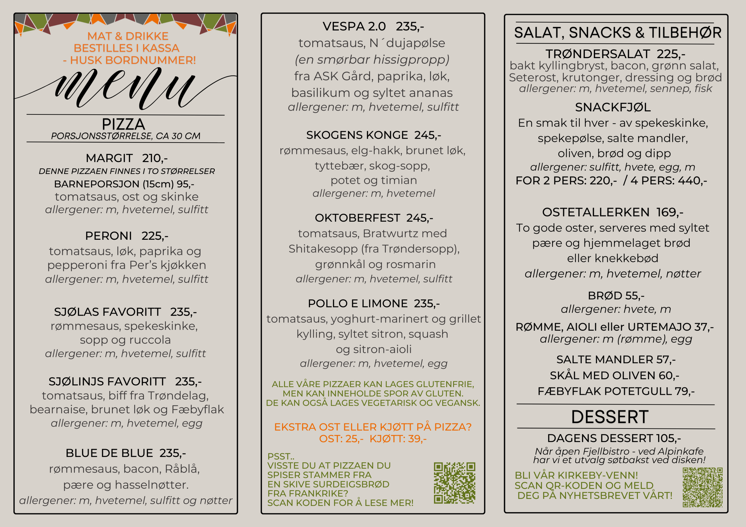 Takeaway-bestillinger vil vi helst ha dagen i forveien, og du kan bestille via epost til booking@kirkebyfjellet.no eller via tlf: 95451245. Hvis samme dag, ring oss så ser vi om vi har kapasitet.