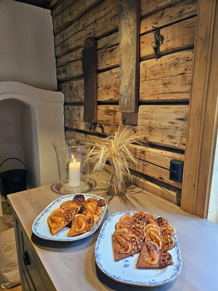 Frokosten får du levert "på rommet", og er en hyggelig frokostpakke bestående av sandwich av hjemmebakt brød og hjemmelaget skinke og norsk gårdsost. Frisk og fruktig eplemost fra Mikkelhaug gård.